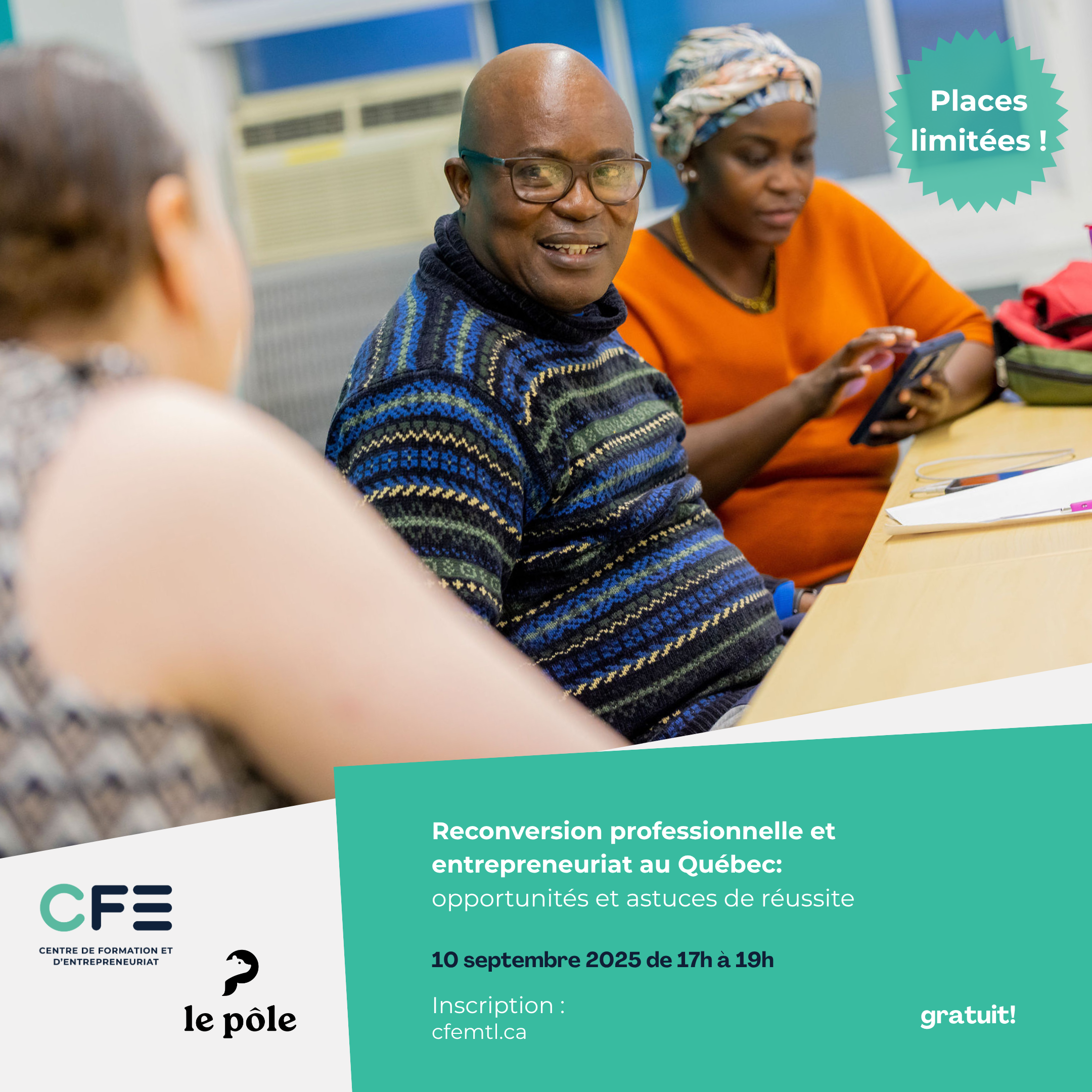 Vous êtes intéressé·e·s par l’entrepreneuriat ? Rejoignez notre atelier « Reconversion professionnelle et entrepreneuriat au Québec : opportunités et astuces de réussite » ! Un atelier gratuit pour explorer les possibilités d’affaires au Québec et repartir avec des idées et outils concrets pour réussir vos projets. Date : 10 septembre 2025 Heure : 17h à 19h Lieu : 11121 Avenue Salk, Montréal QC, H1G […]